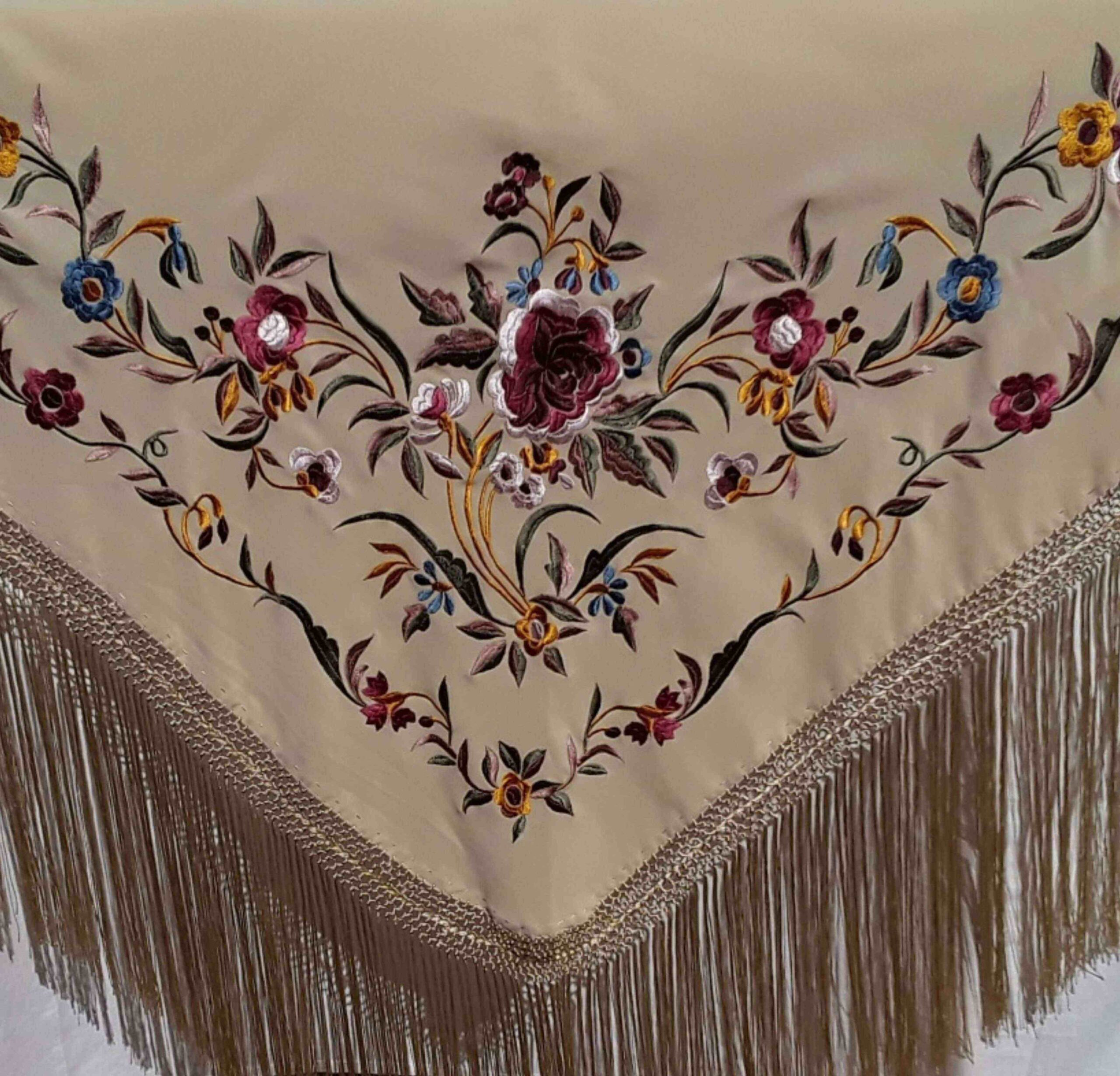 Color beige claro con flores bordadas en tonos burdeos, mostaza y azul. Elegante y luminoso, con flecos en tono tostado que completan su estilo clásico.