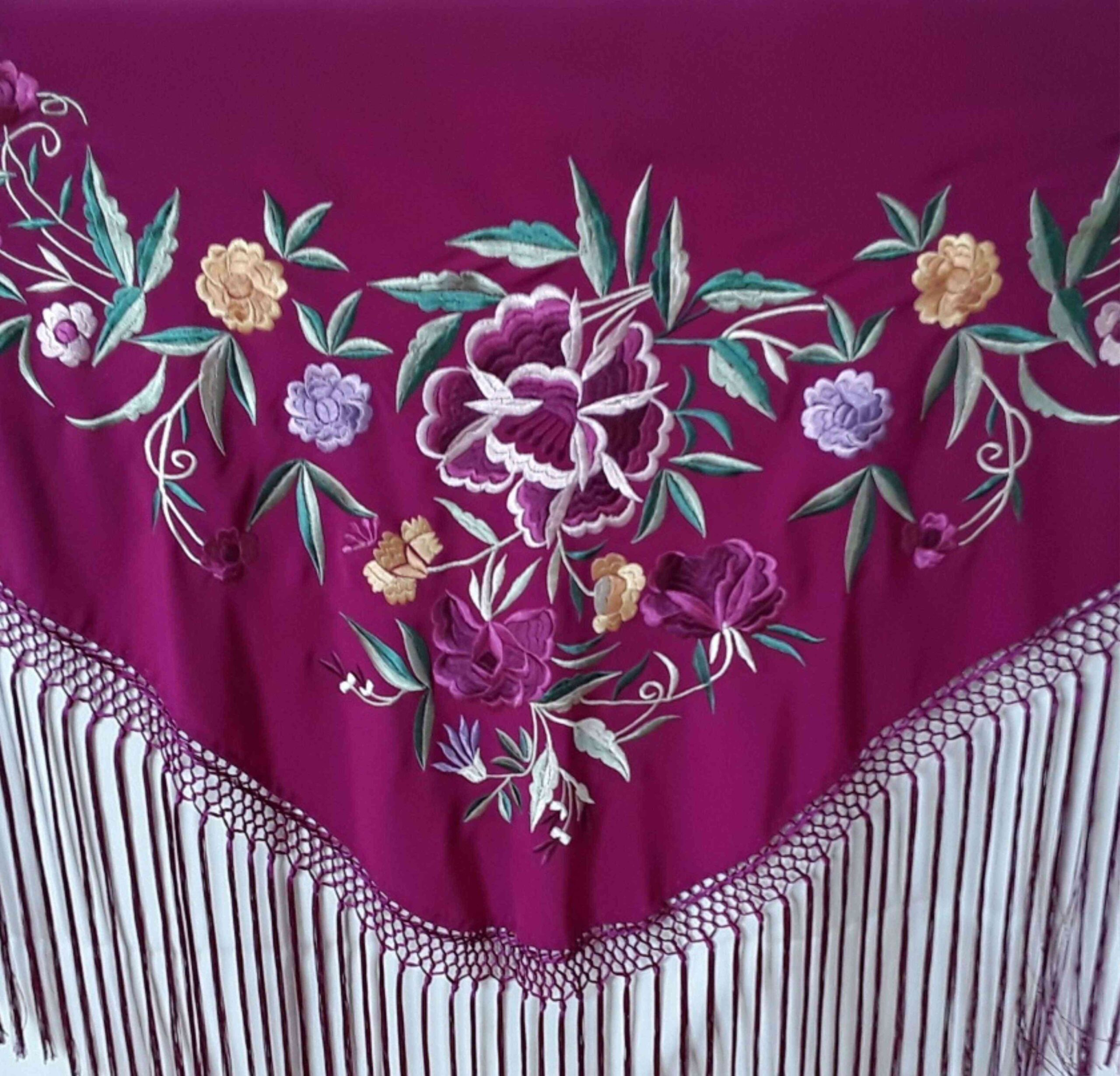 Color buganvilla con flores bordadas en tonos burdeos, amarillo y lila. Alegre y vistoso, con flecos a juego que realzan su estilo festivo y elegante.