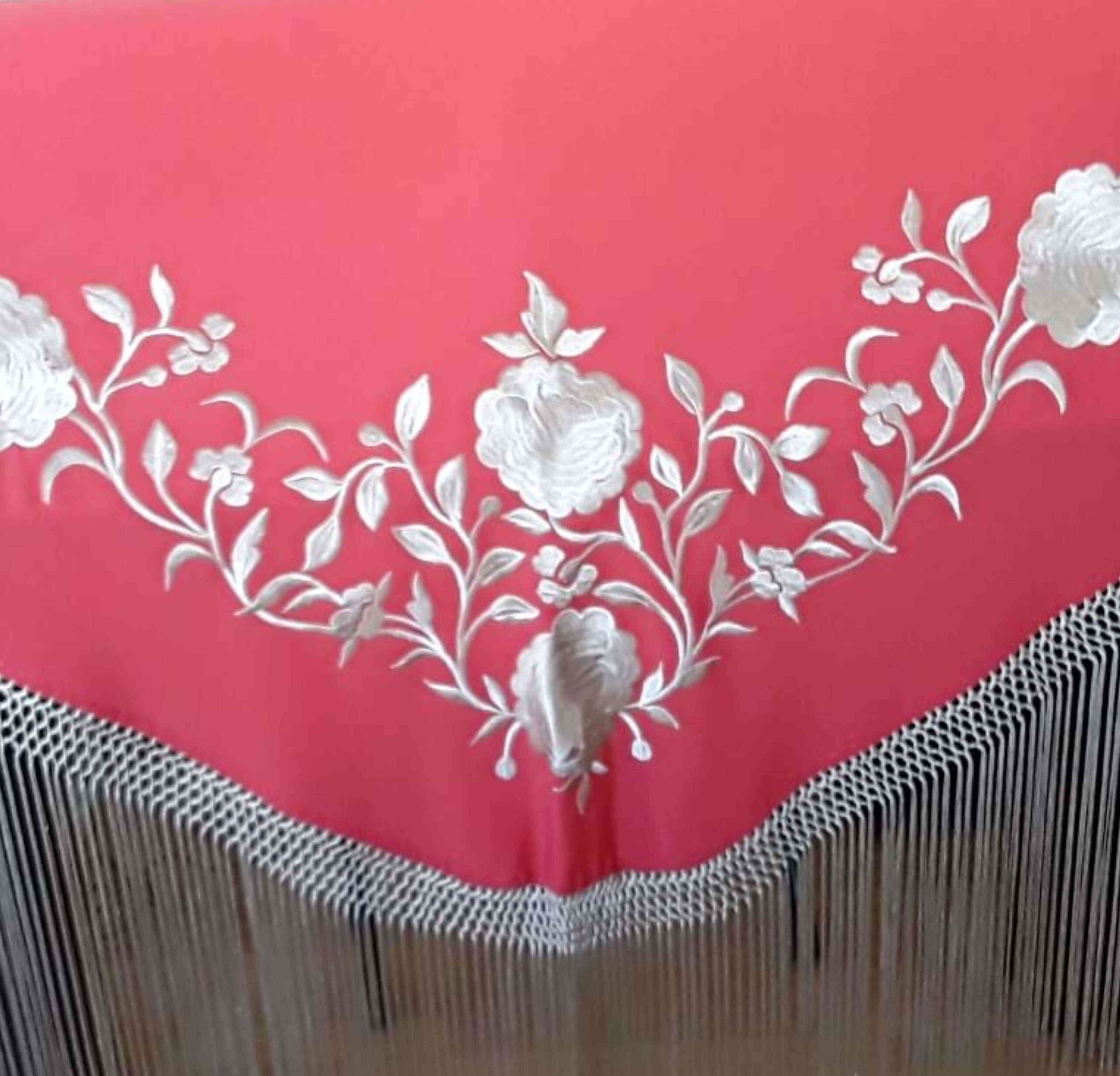 Color coral con flores bordadas en blanco. Sencillo y elegante, con flecos claros que aportan contraste suave y movimiento delicado.