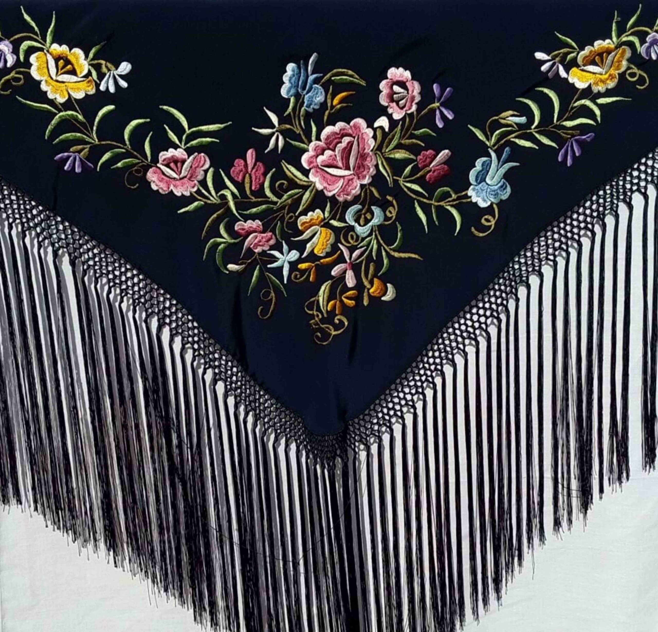 Base negra con flores bordadas en rosa, azul, amarillo y lila. Diseño armonioso y elegante, con flecos oscuros que aportan movimiento y estilo.