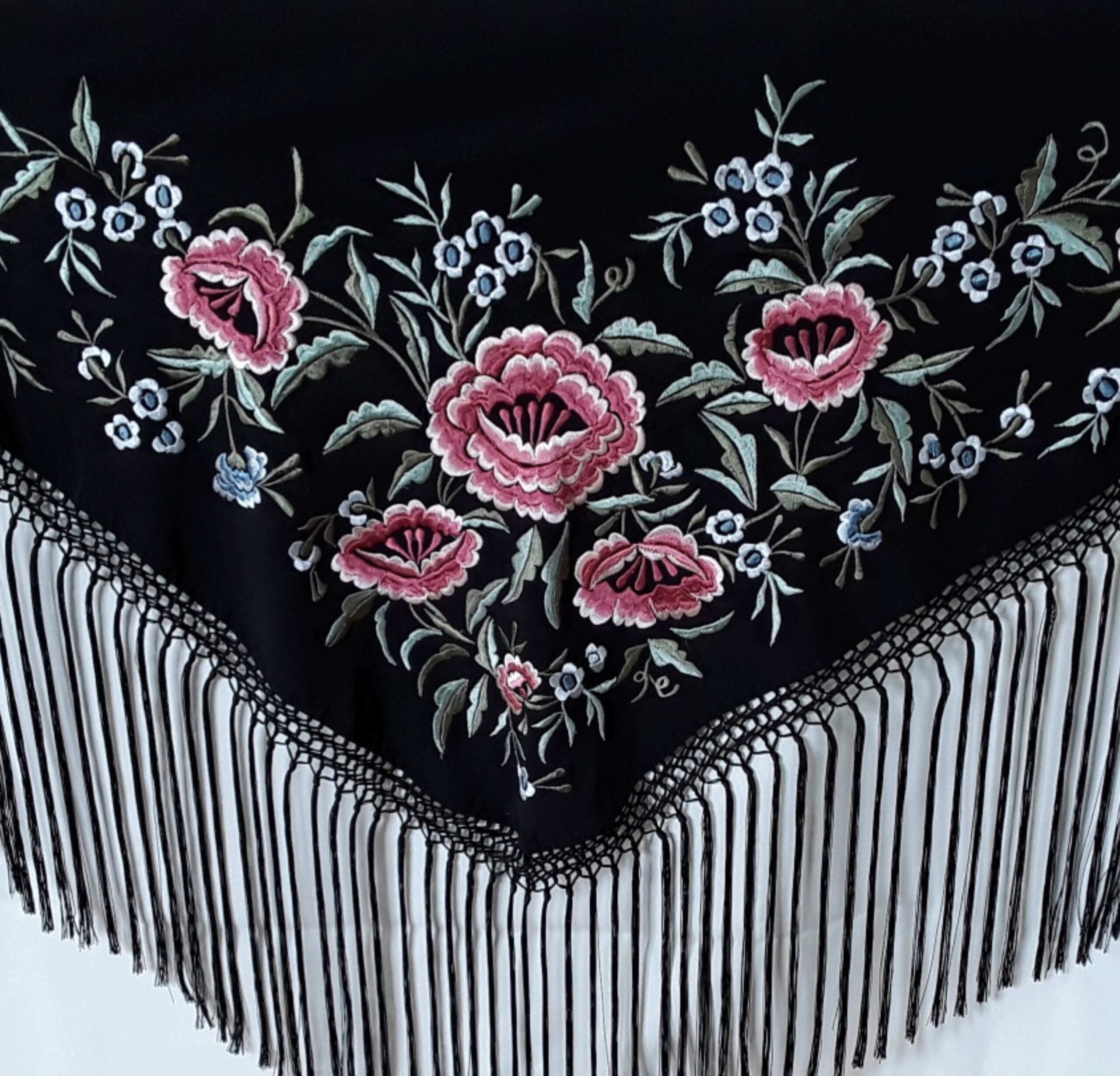 Fondo negro con flores bordadas en rosa viejo y azul celeste. Delicado y armonioso, con flecos bicolor que aportan movimiento y contraste elegante.