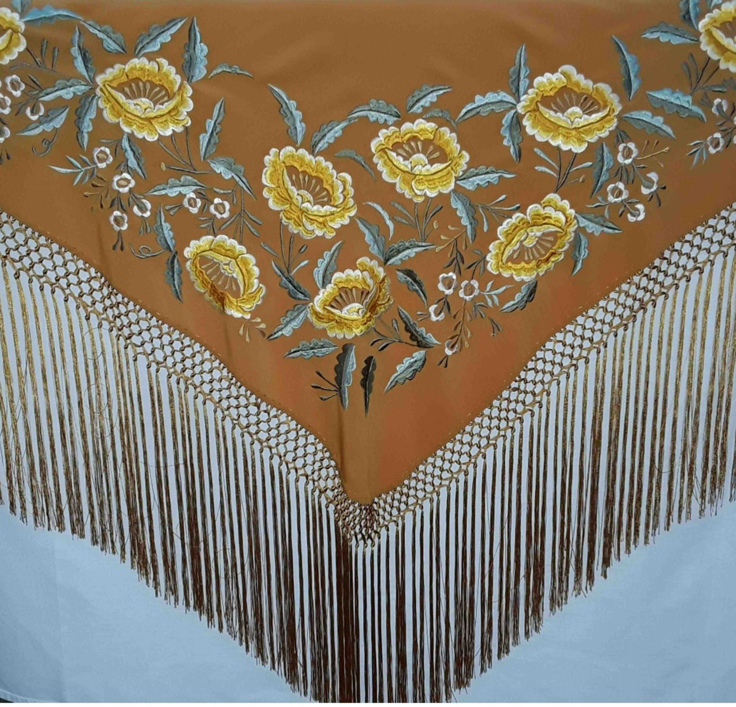 Color ocre con flores bordadas en tonos amarillos y detalles en hojas verde azulado. Sofisticado, cálido y lleno de carácter tradicional.
